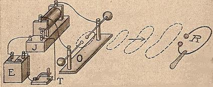 findings. Asked upon the usefullness of his finding Hertz stated: ![]() The Hertz experiment: E = Energiequelle (Batterie), T = Taster, J = Induktionsspule, O = Wellensender (Oszillator) R = Resonator. When a spark occurres, then electromagnetic waves where produced at the wavetransmitter O and are recognizable at some meters apart. Tiny sparks were recognazied at the resonator R. (Source(1): Dr. F. Fuchs, Der praktische Radionamateur, 1924, Stuttgart, Franksche Verlagshandlung) Hertz did not worked any longer on this field of physics. Nobody took any serious care on electromagnetic waves for about 10 years |