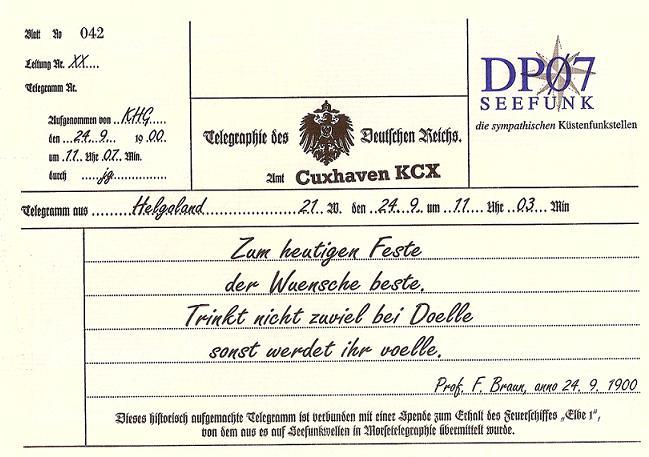 Asked to cable something which should be transmitted to the Kugelbake at Cuxhaven, Braun sent this text, which is displayed on a form of that time: